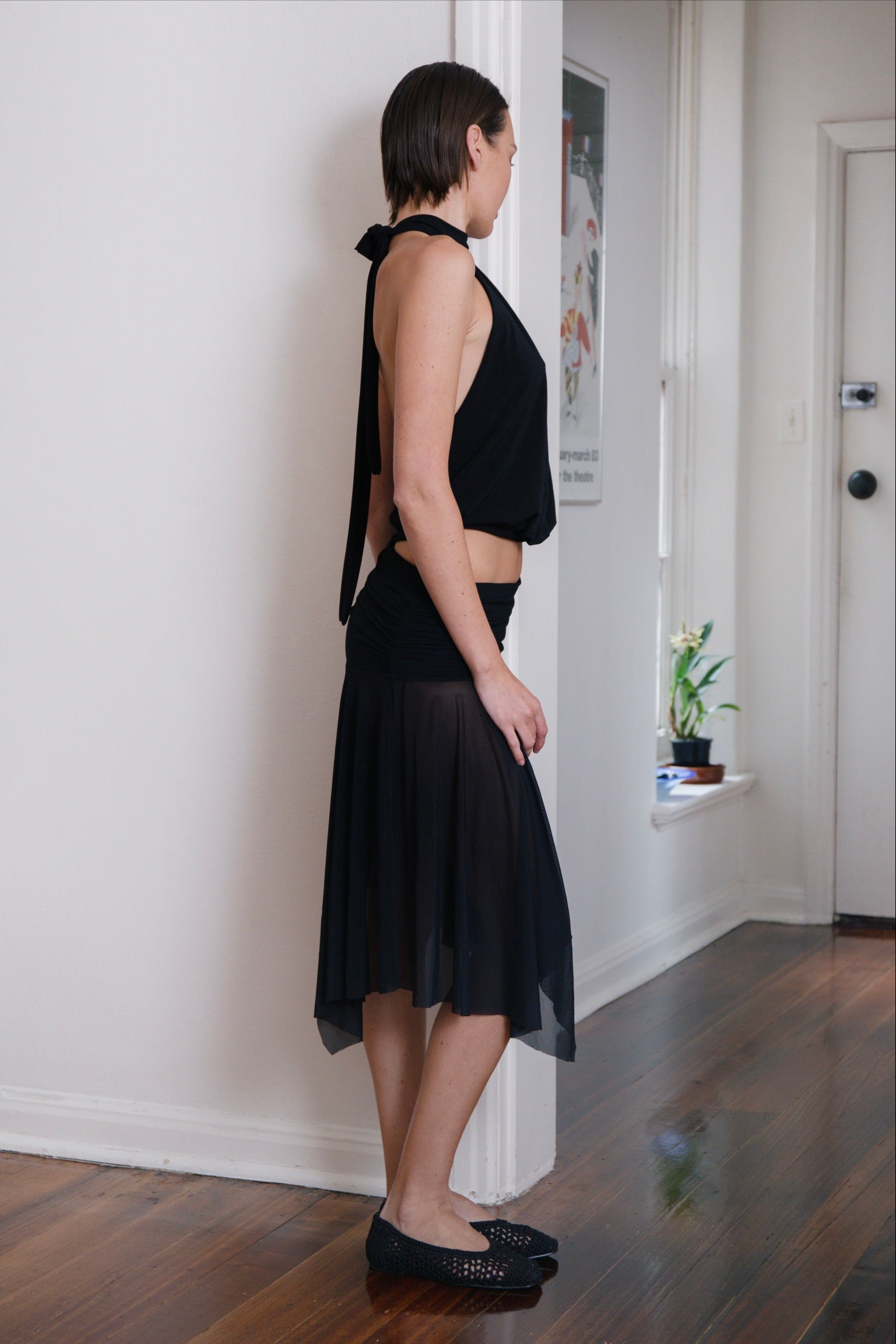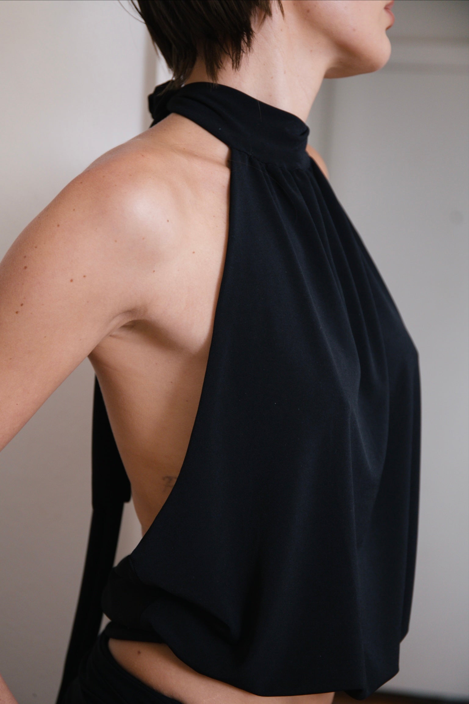 It features a high gathered neckline that ties elegantly at the back with long, soft straps, creating a beautiful open-back silhouette. The sides plunge low for a sleek, minimal look, while the elasticated waistband brings gentle shape and allows the fabric to fall in effortless drapes.