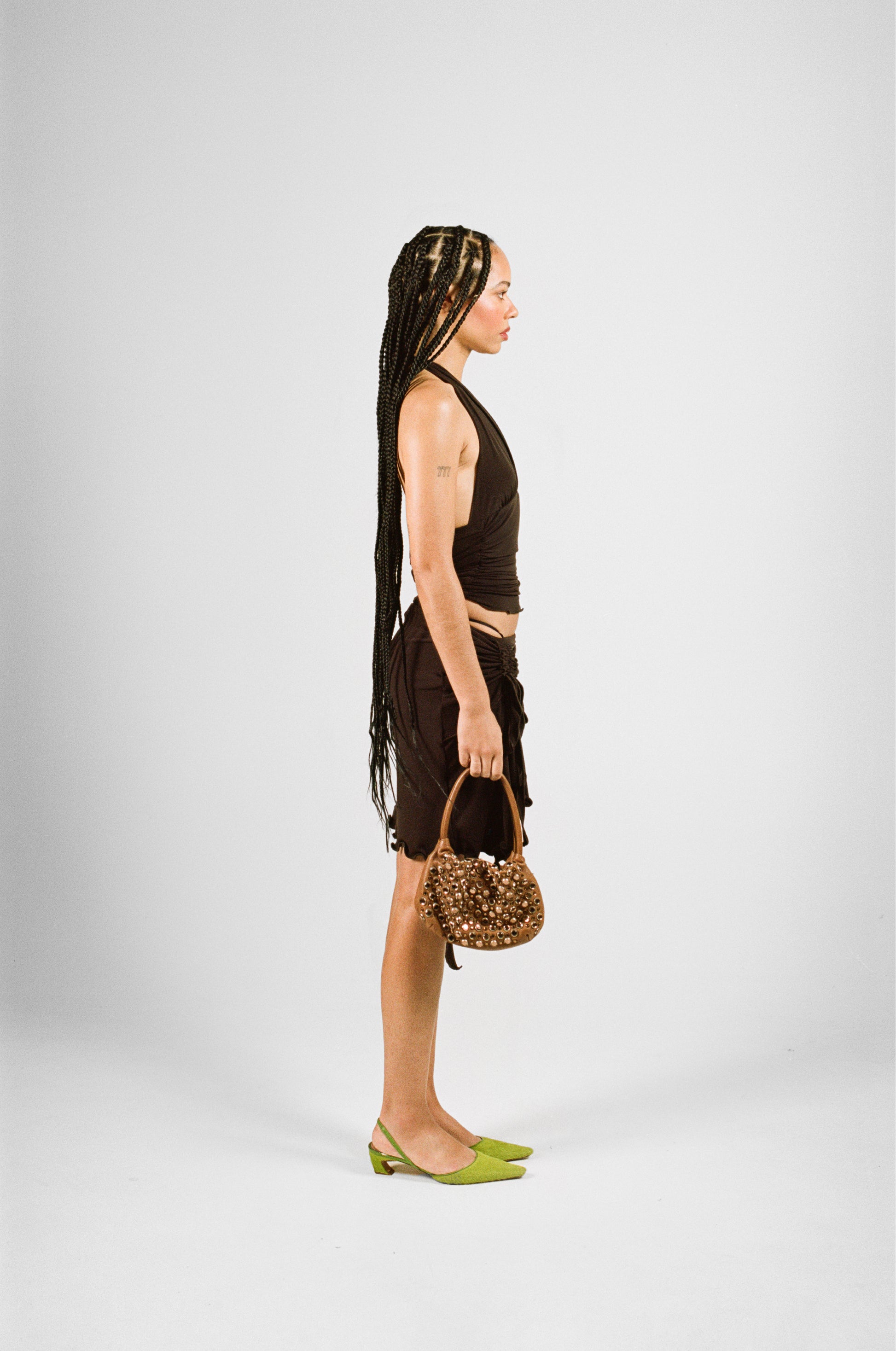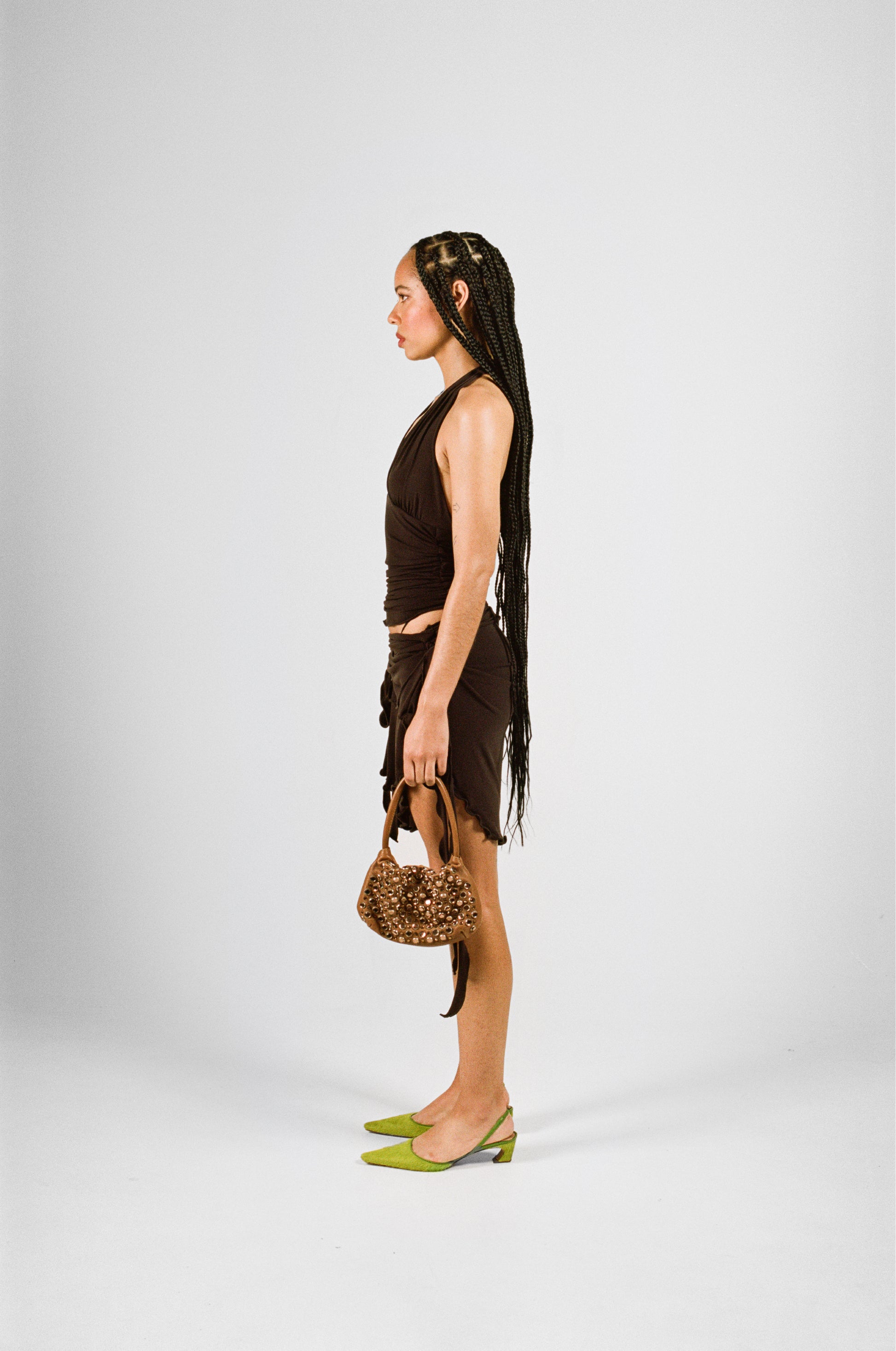Gathered waist halter made out of Brown ITY 4 way stretch.
