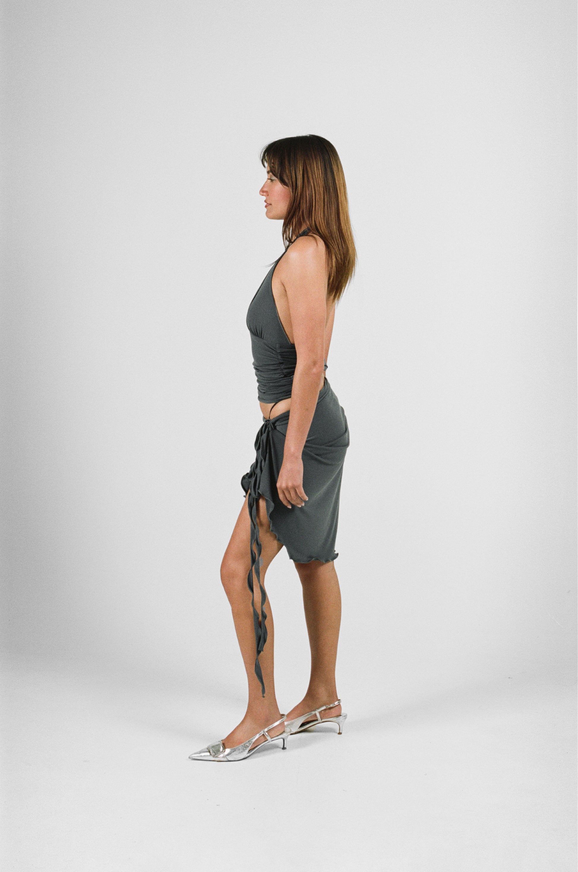 Gathered waist halter made out of Charcoal ITY 4 way stretch.