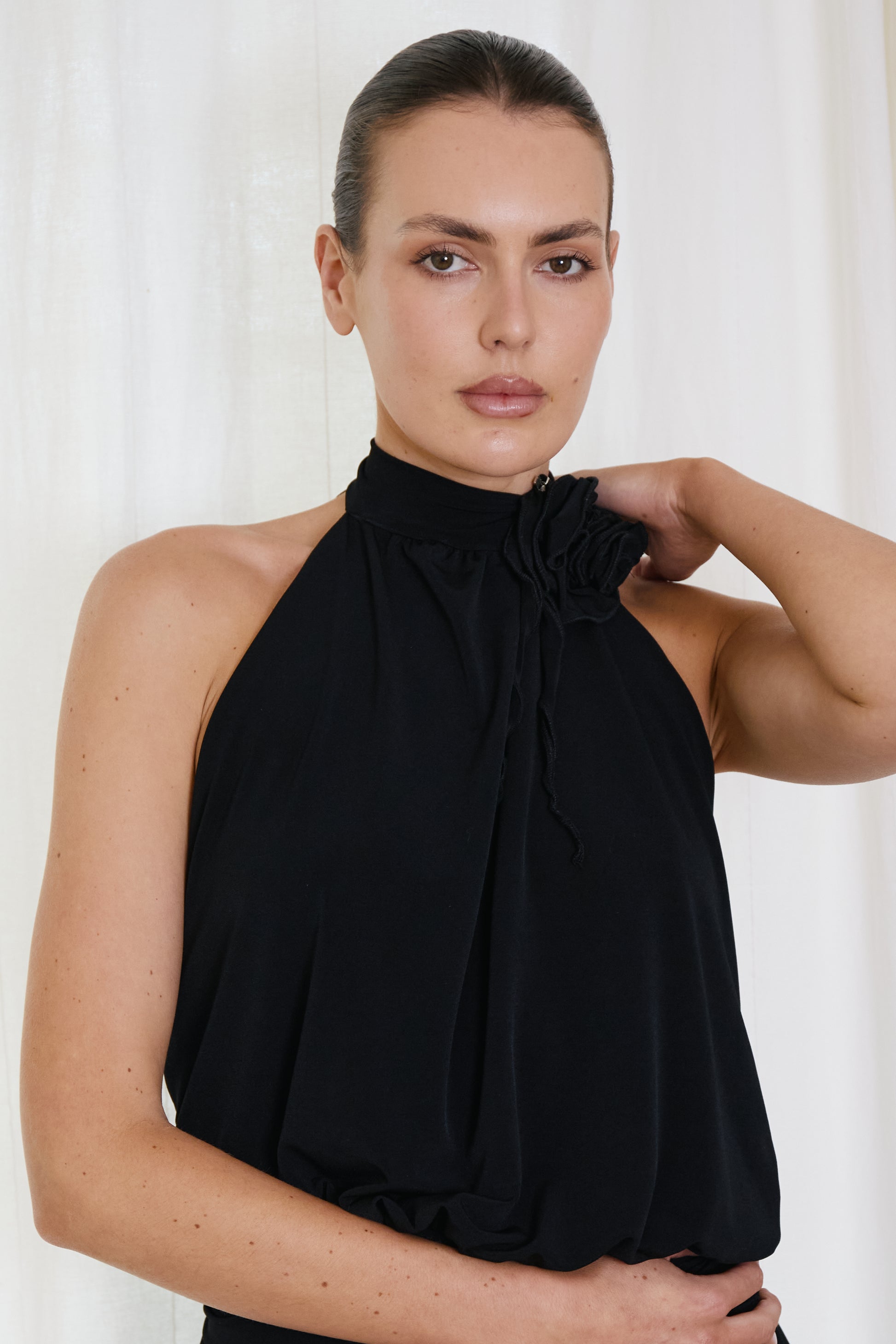 Pearly wears our elegantly draped halter top, designed to tie gracefully around the neck and showcase a beautifully draped back. The fitted, gathered band at the hips adds shape and balance to the silhouette.
