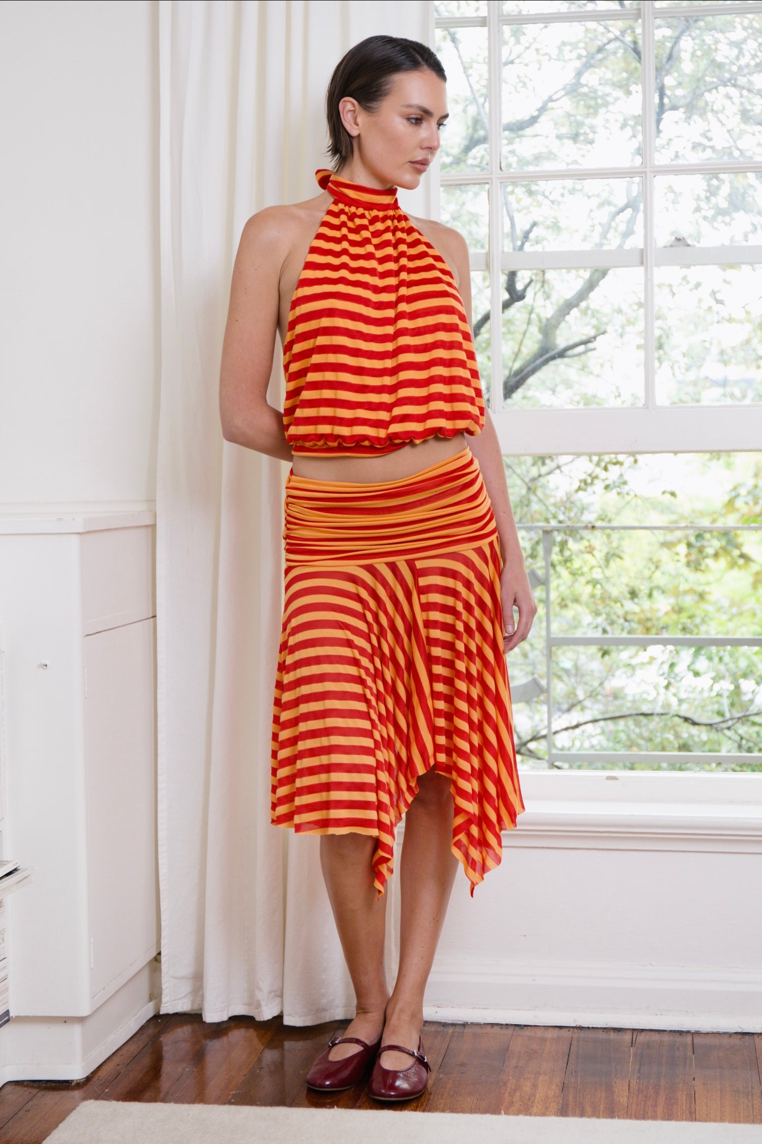 The gathered, double-layered waistband offers gentle structure and versatile styling. Wear it high on the waist for a soft, feminine drape, low on the hips for a relaxed look, or pull it up and transform it into a strapless dress. As a dress, the striped stretch cotton falls effortlessly over the body, creating a fluid, easy silhouette that feels both comfortable and refined.