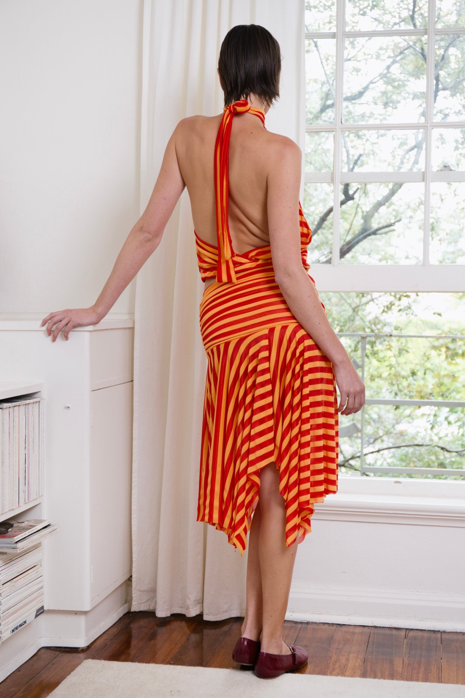 A bold halter top featuring soft, fluid draping and a striking wavy stripe pattern in vibrant red and marigold.