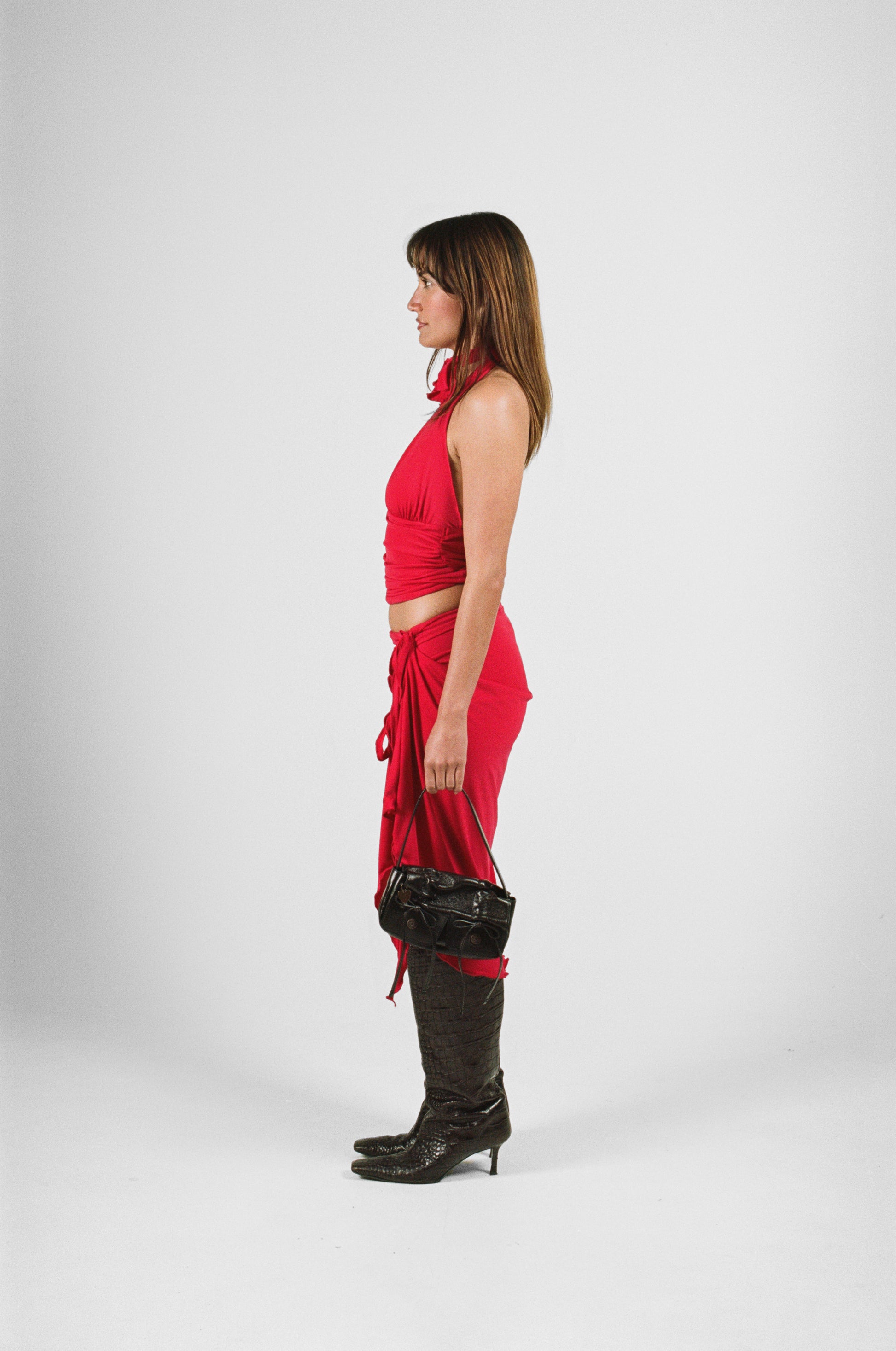 Gathered waist halter made out of Red ITY 4 way stretch.
